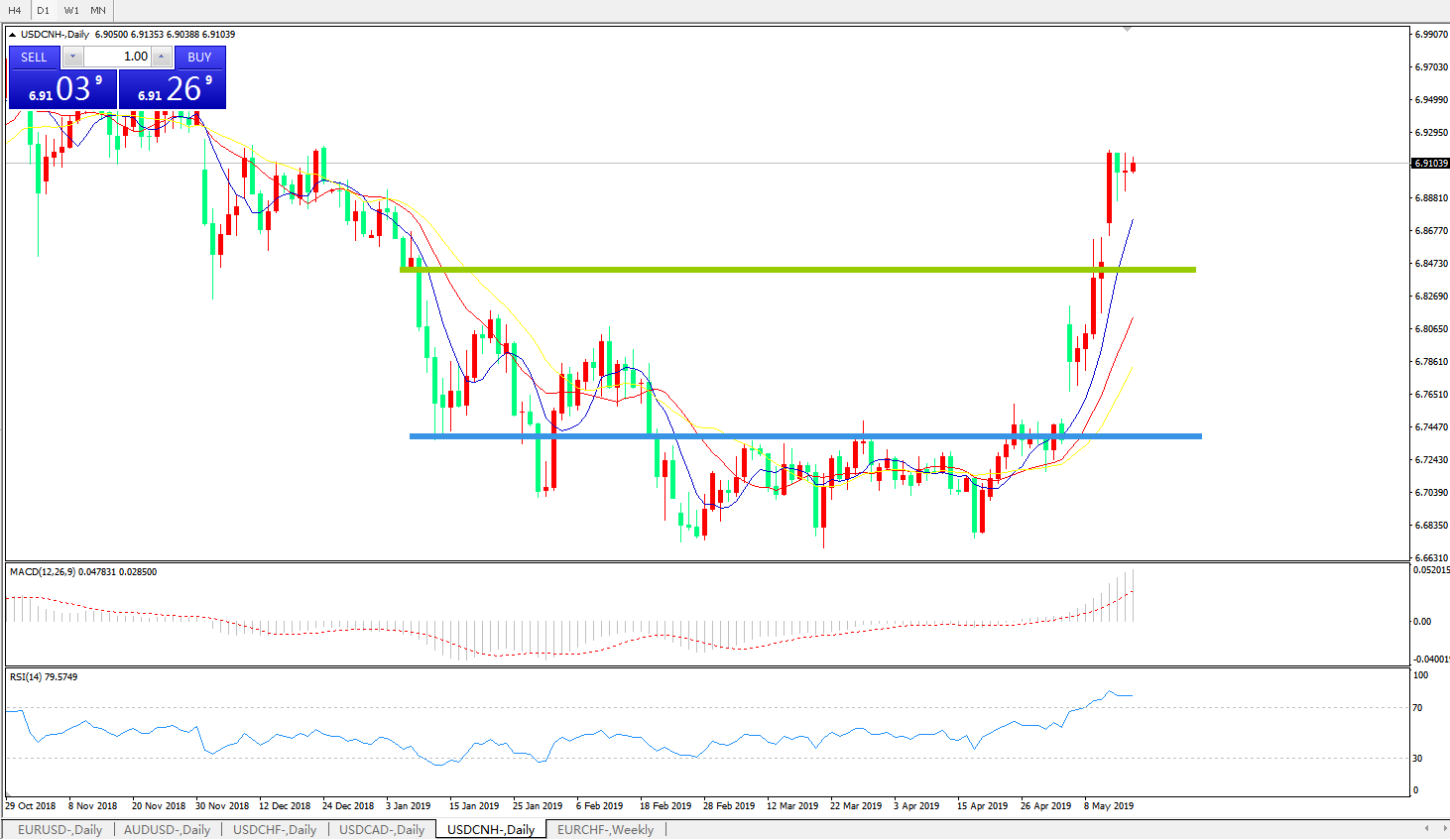 备选策略: 在6.8450之下,看跌,目标价位为6.7370,然后为6.6690 。