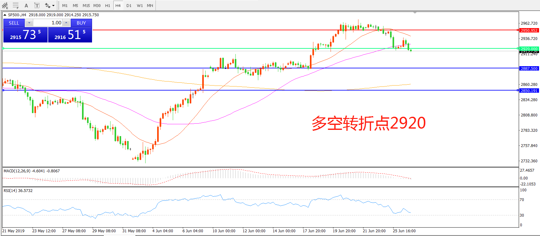 4小时图看,标普震荡上行后高位跳水,显示上方2950附近阻力依然较强,均线系统有拐头迹象,MACD红柱减少,RSI指标向下,日内延续下行概率较大。