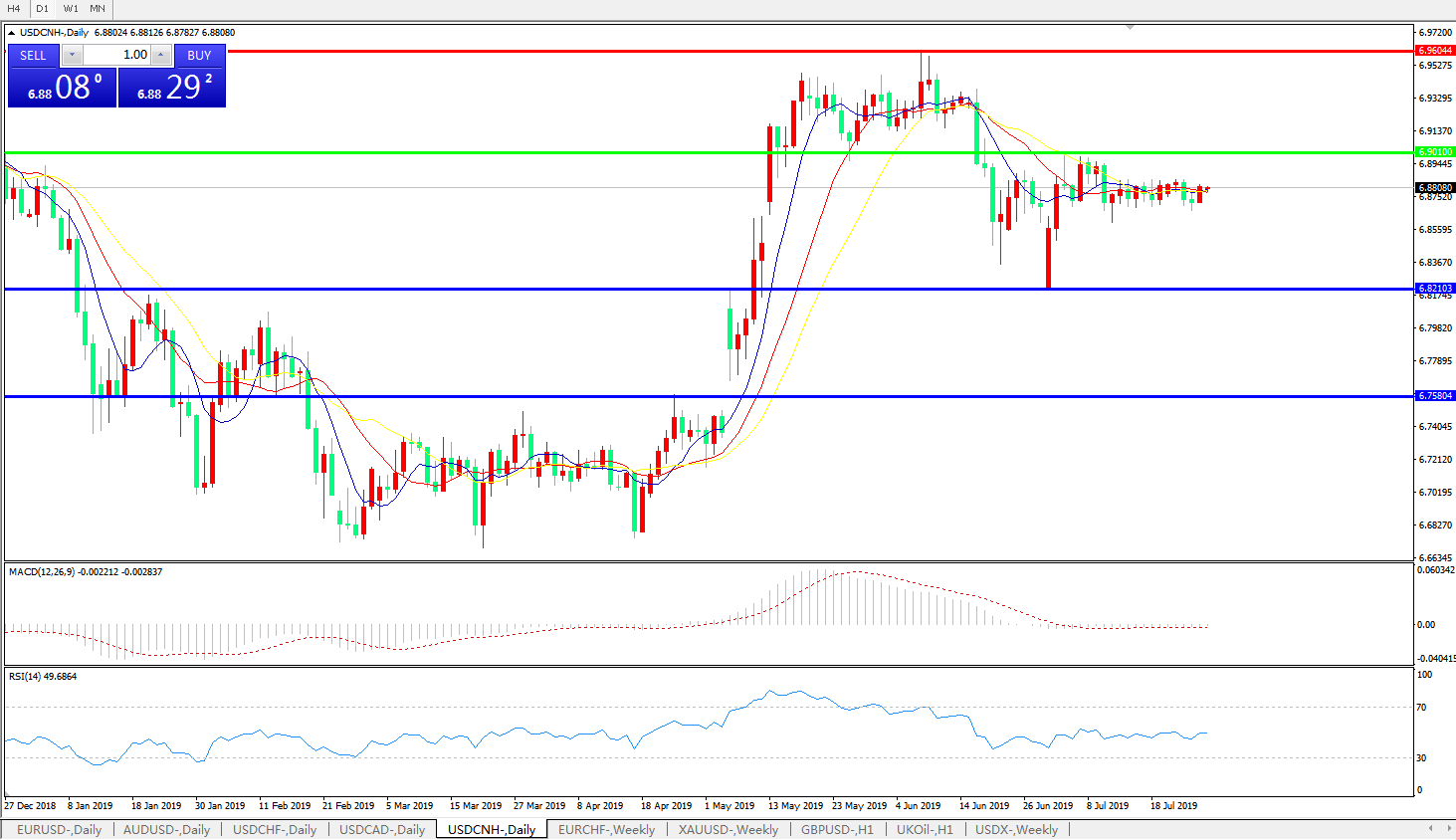 交易策略: 在6.9010之下,看跌,目标价位为6.8210,然后为6.7580。