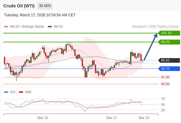在 93.70 之上,看涨,目标价位为 99.25 ,然后为 101.10 。