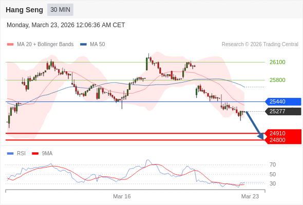 恒生指数 当日内: 存在压力。