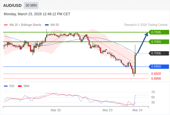 在 0.6950 之上,看涨,目标价位为 0.7055 ,然后为 0.7095 。