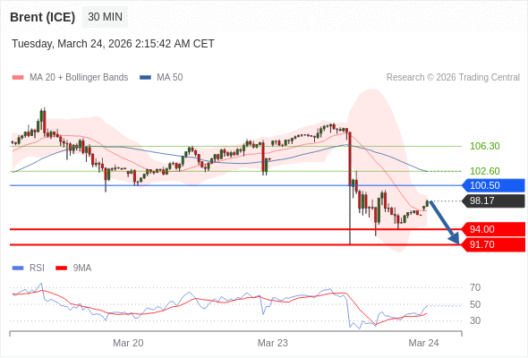 布伦特原油 (ICE) (M6) 当日内: 期待94.00。