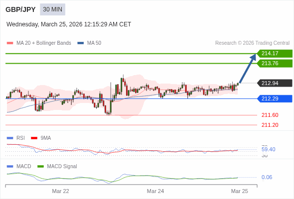 英镑/日元 当日内 : 看涨,当 212.29 为支撑位。