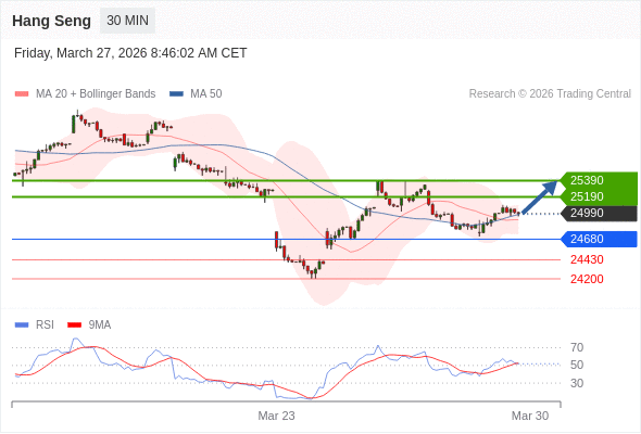 恒生指数 当日内: 目标位为25390。