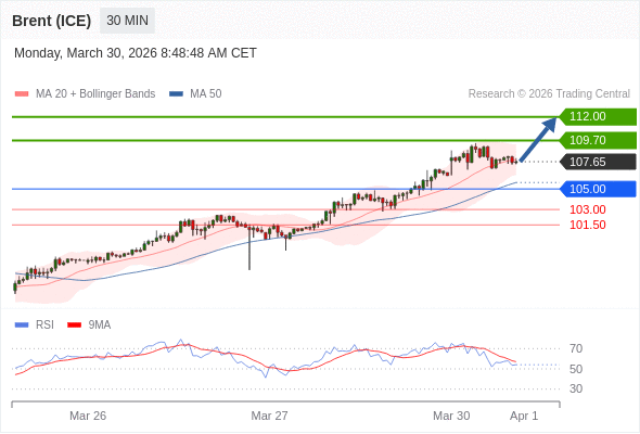布伦特原油 (ICE) (M6) 当日内: 看涨。