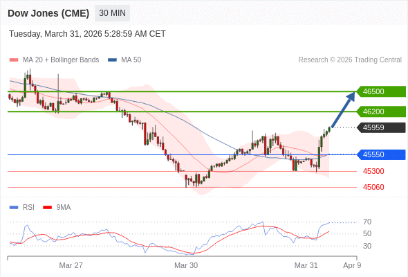 在 45550 之上,看涨,目标价位为 46200 ,然后为 46500 。