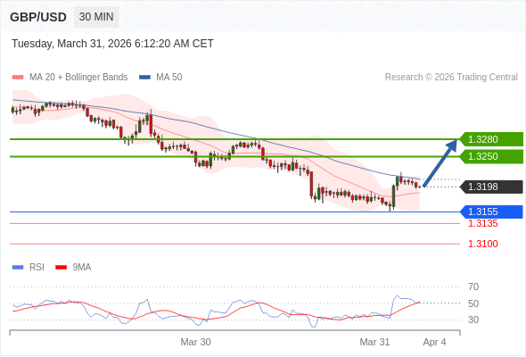 在 1.3155 之上,看涨,目标价位为 1.3250 ,然后为 1.3280 。