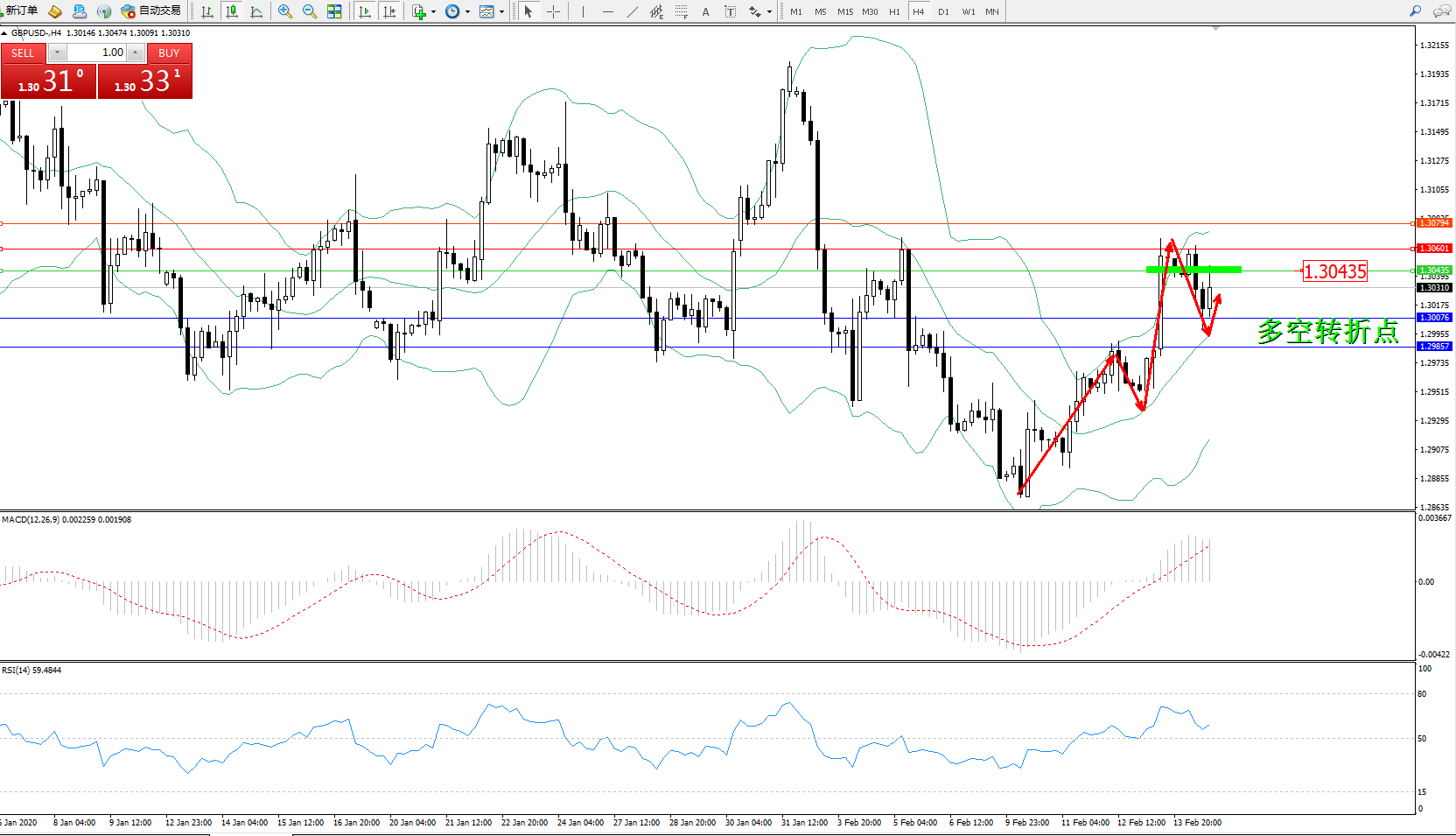 备选策略:1.30435上方看涨,目标1.30601、1.30794