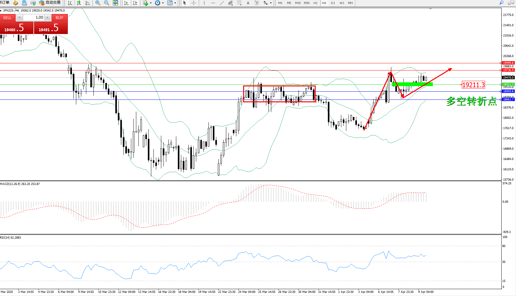 日经指数JPN225——4小时K线图显示: