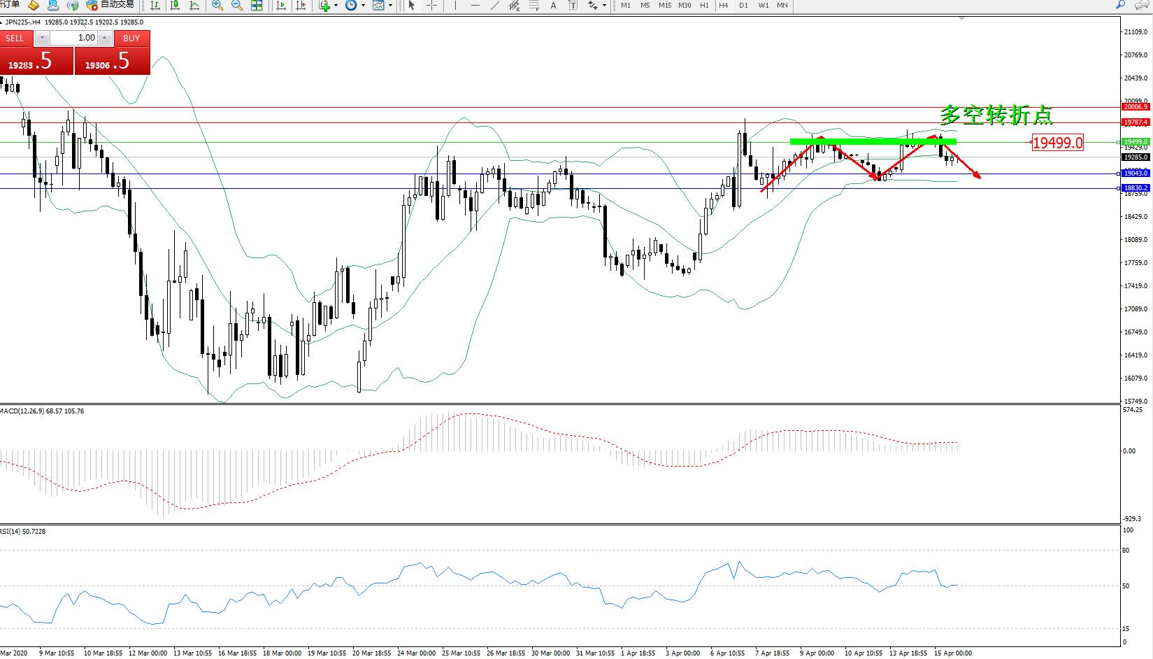 日经指数JPN225——4小时K线图显示:
