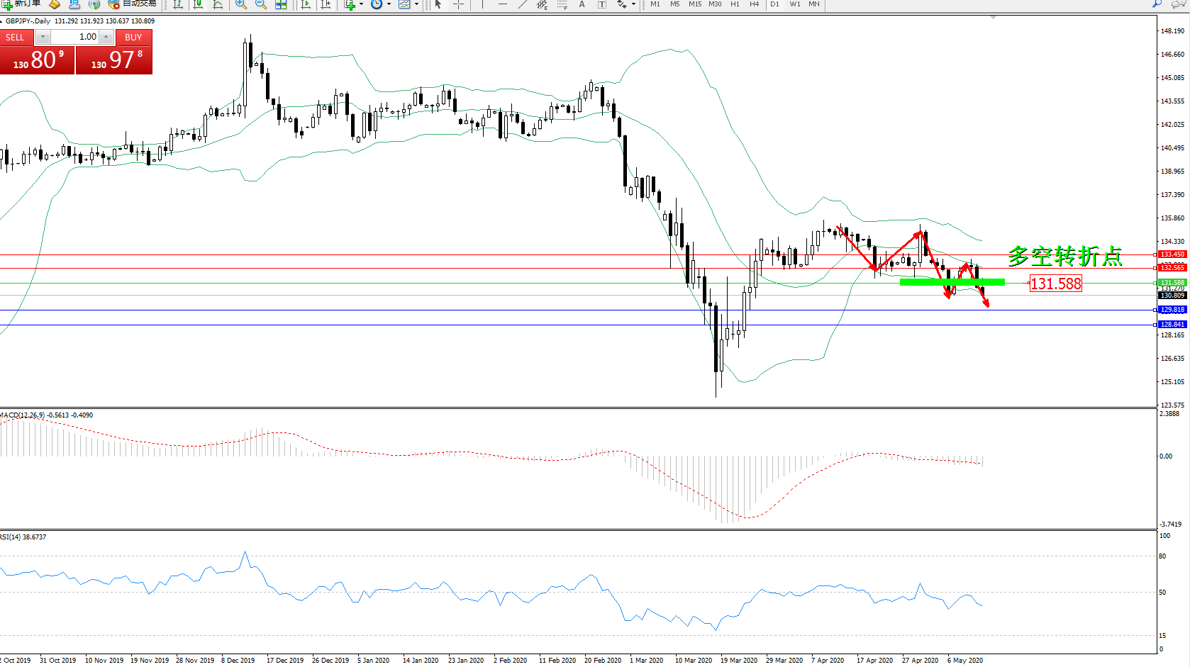 交易策略:131.588下方看跌,目标129.818、128.841