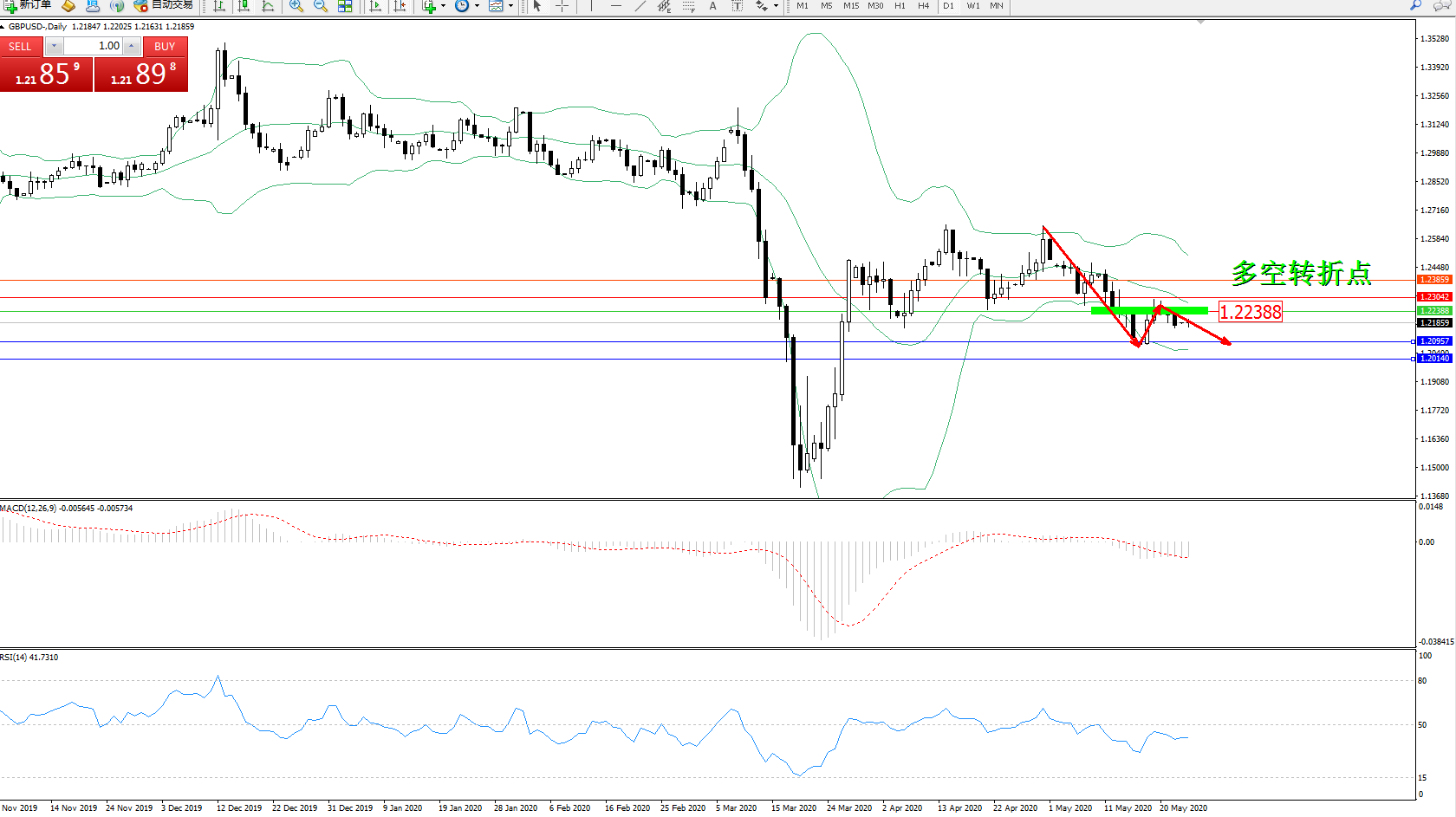 交易策略:1.22388下方看跌,目标1.20957、1.20140