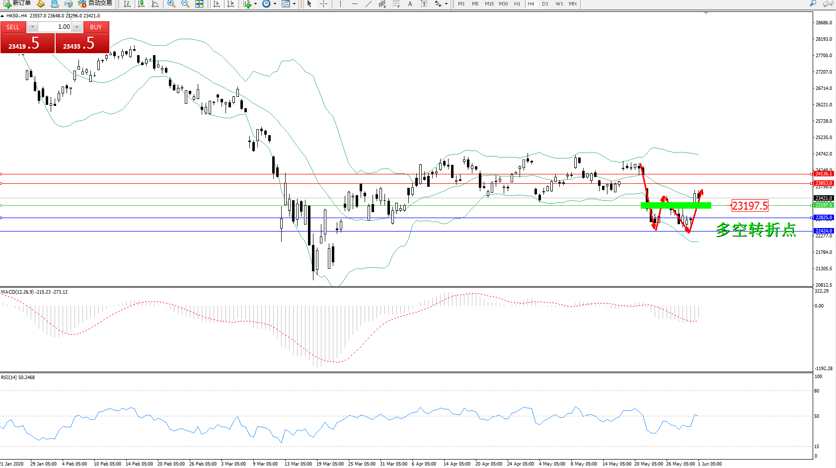 恒指HK50 ——4小时K线图显示: