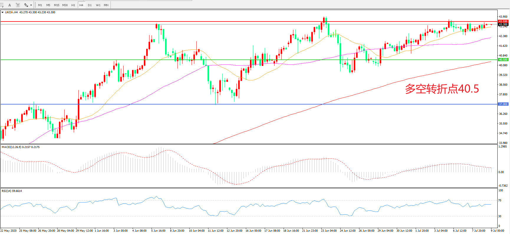 周三(7月8日),美国EIA原油库存增加565.40万桶,远高于预期减少318.9万桶,成品油库存表现喜忧参半,布伦特原油延续高位震荡,收报43.28美元/桶。进入2020年下半年的全球经济依然受到新冠肺炎疫情的沉重打击,企业复工复产看上去摇摇欲坠,整体来看,油价近期持续交投于43美元附近,多空相对焦灼,等待突破后再顺势操作较为可行。