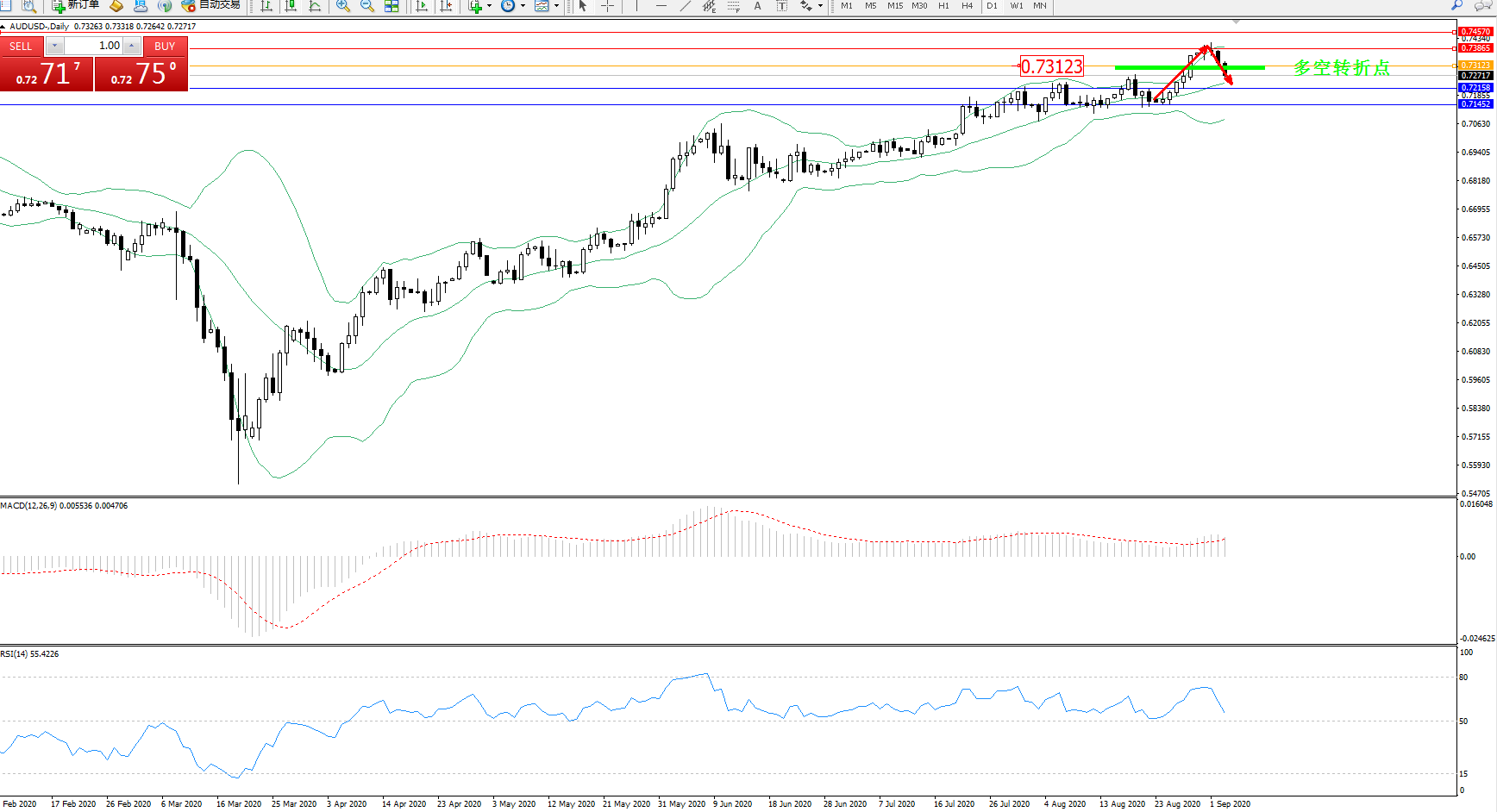 备选策略:0.73123上方看涨,目标0.73865、0.74570