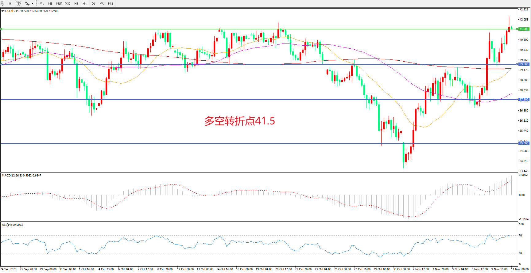 4小时图看,油价阳线连续拉升,短期表现偏强,41.5是前期整理区间上沿,如能突破站有望开启新一轮的涨势,MACD红柱增加,RSI指标走平,日内延续上行概率较大。
