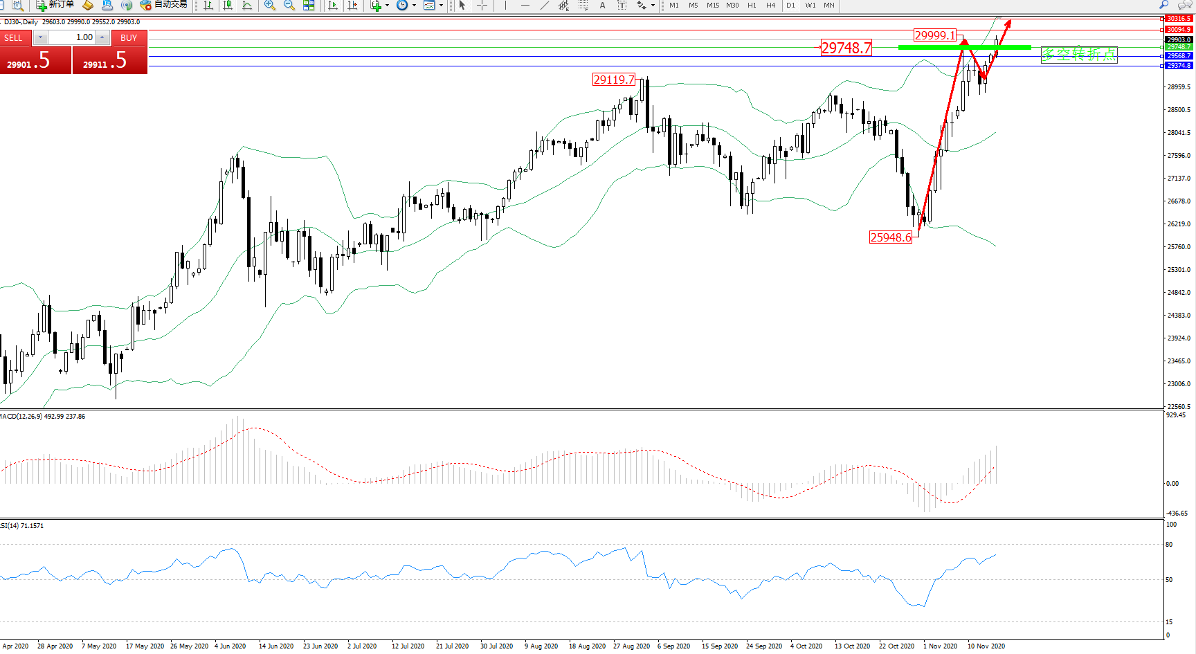 道琼斯指数11月16日(周一)收盘上涨470.60点,涨幅1.60%,报29950.44点。美股收盘,三大指数集体收涨,道指初步收涨约480点,邮轮概念股、能源股走高,双十一板块走低。随着新冠感染住院人数激增以及全球民众活动减少,美元可能在本月反弹。新冠肺炎三期试验疫苗有效性为94.5%。计划在未来几周内向美国申请新冠疫苗的紧急使用权,同时也向其他全球监管机构提交新冠疫苗以获得授权。有望于2021年在全球生产5亿至10亿剂的新冠疫苗。相比起上周辉瑞发布的疫苗需要在-70摄氏度的苛刻环境下保存运输的状况,Moderna版疫苗被证实在2-8摄氏度普通冷藏室中存放30天后仍可保持活力,这极大减轻了疫苗的保存、运输与分发成本,令全球各国在短时间内控制乃至扑灭新冠病毒疫情成为可能。