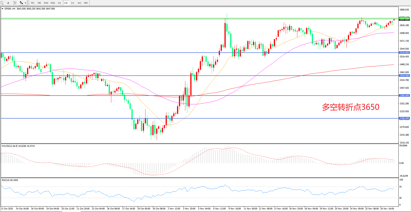4小时图看,标普500延续窄幅震荡,整体波幅不大,3650成为短期多空分水岭,21周期均线成为短期支撑, MACD红柱增加,RSI指标向上,日内延续上行概率较大。