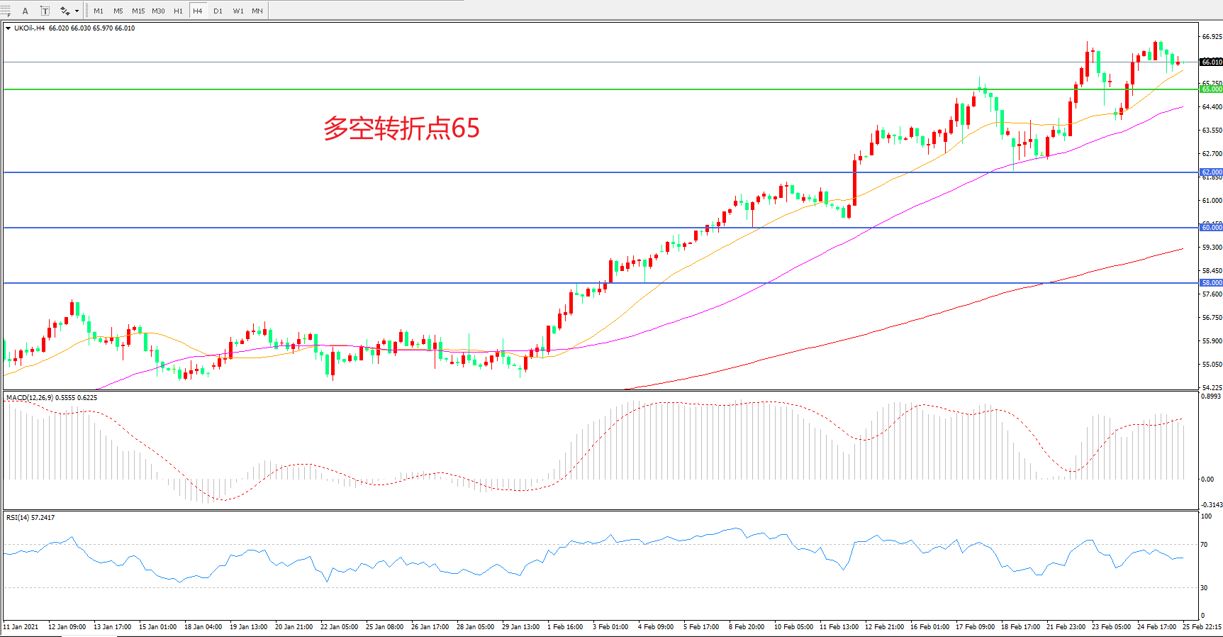4小时图看,油价连续走高后出现调整,但整体依然表现强势,65美元形成下方支撑,均线系统呈多头排列,MACD红柱缩短,RSI指标走平,日内震荡上行概率较大。