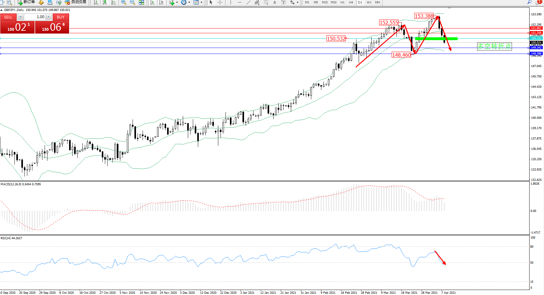 交易策略:150.532下方看跌,目标149.342、148.588