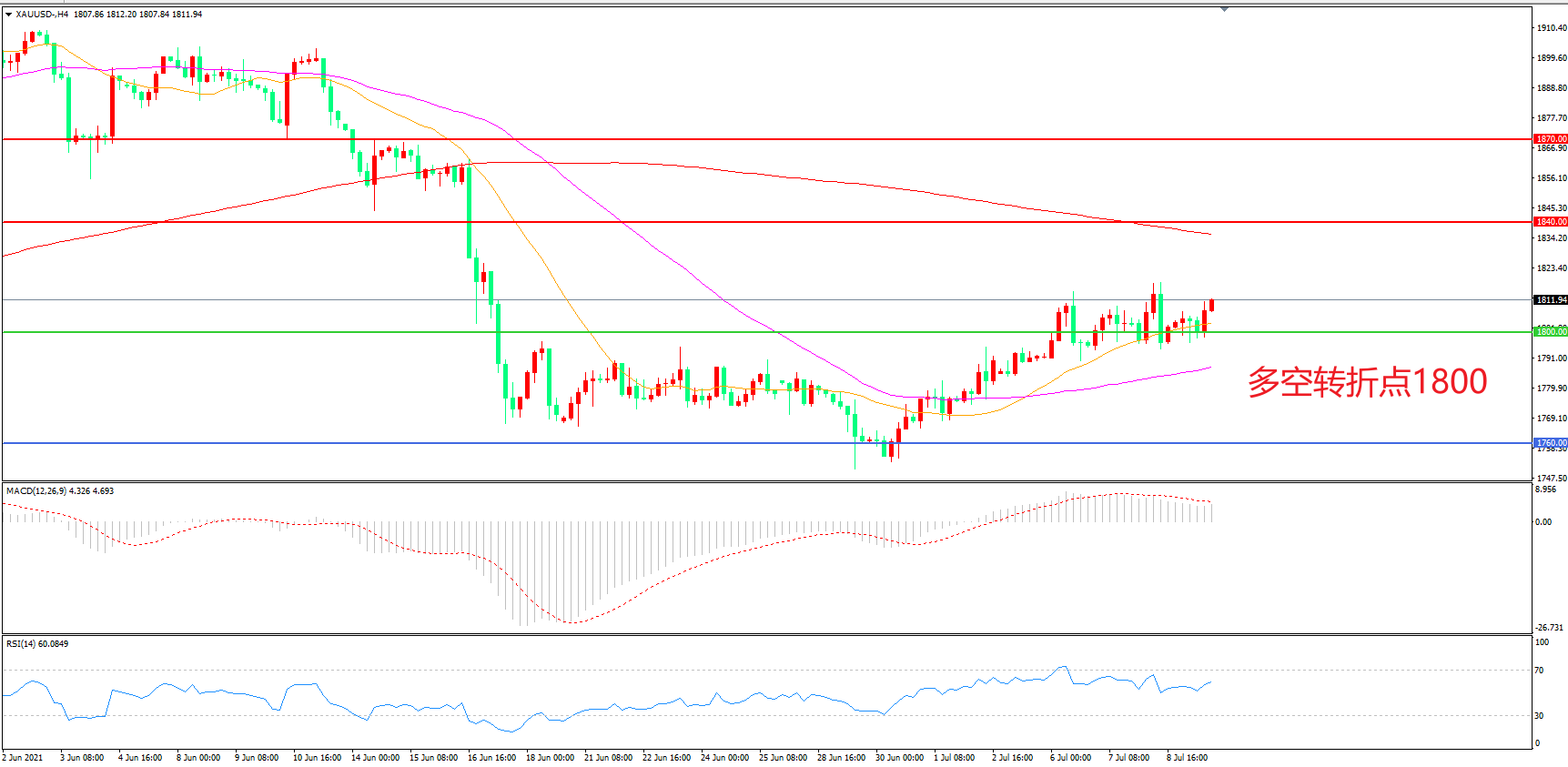 交易策略:  在1800.00之上看涨,目标1840.00        1870.00