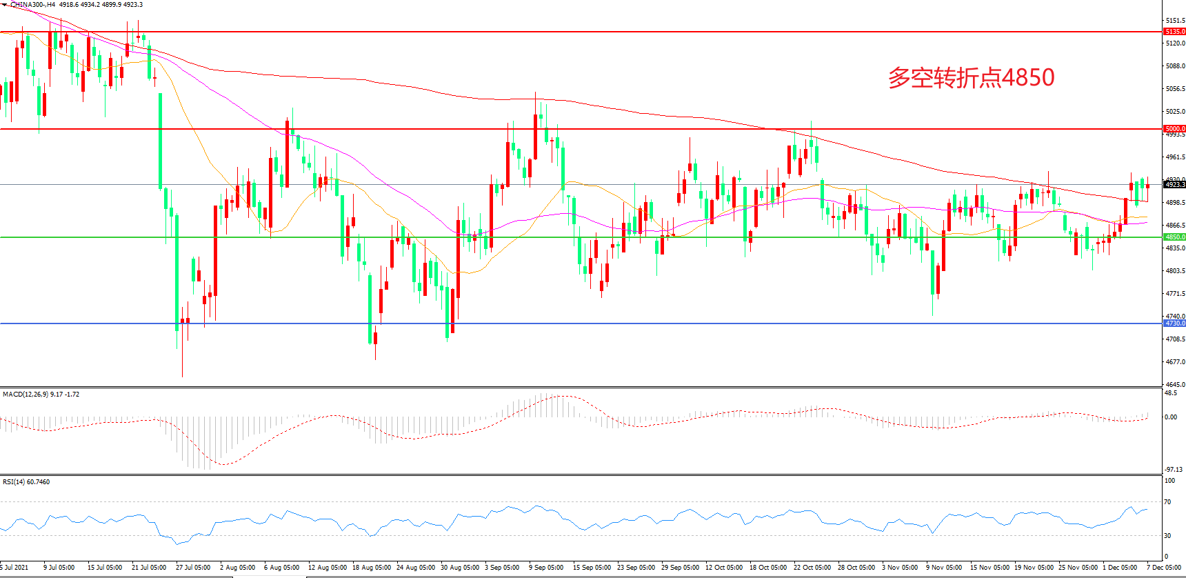4小时图看,沪深300突破200均线后冲延续震荡,短期表现有所回暖,均线系统形成下方支撑,MACD红柱增加,RSI指标走平,日内震荡上行概率较大。