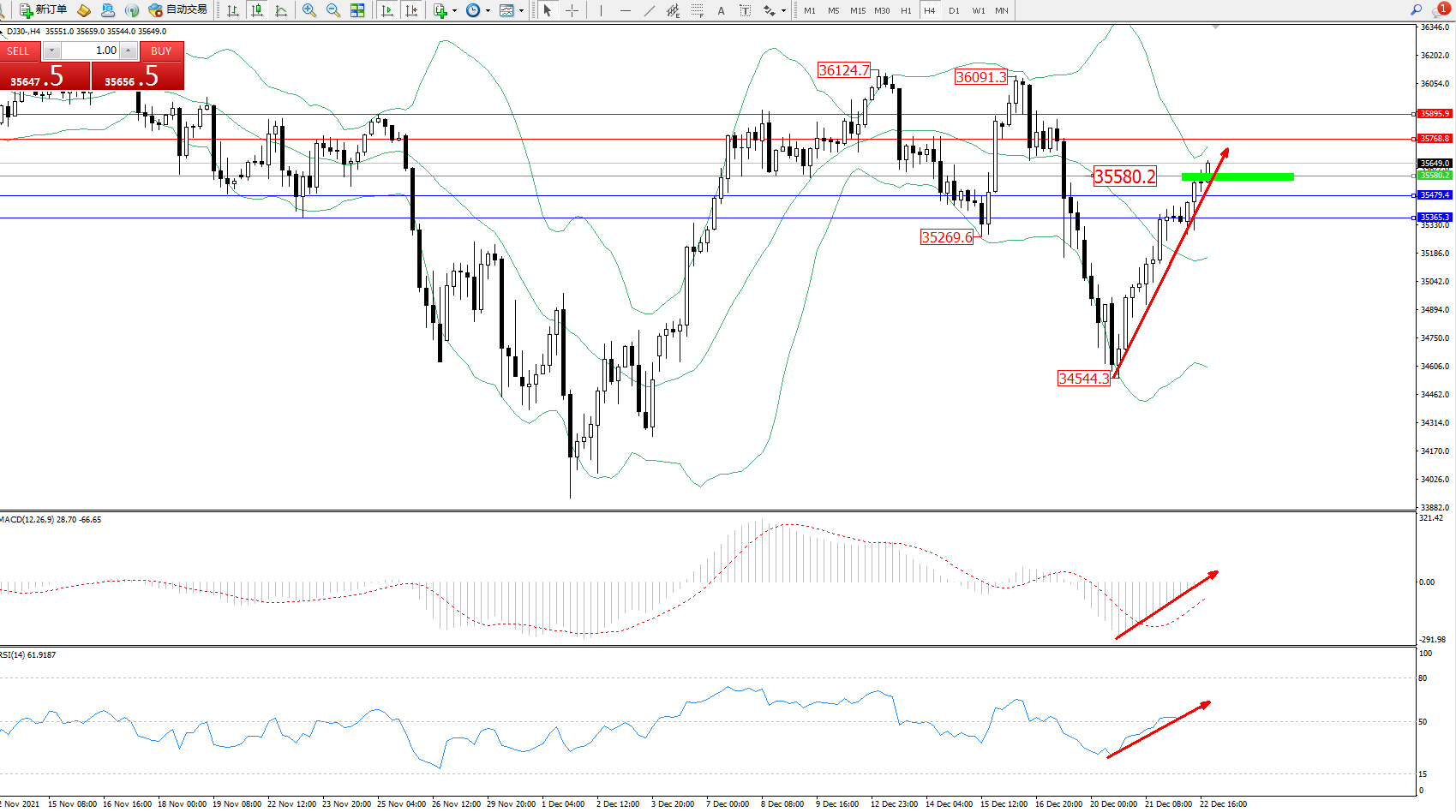 道琼斯指数DJ30——4小时K线图显示: