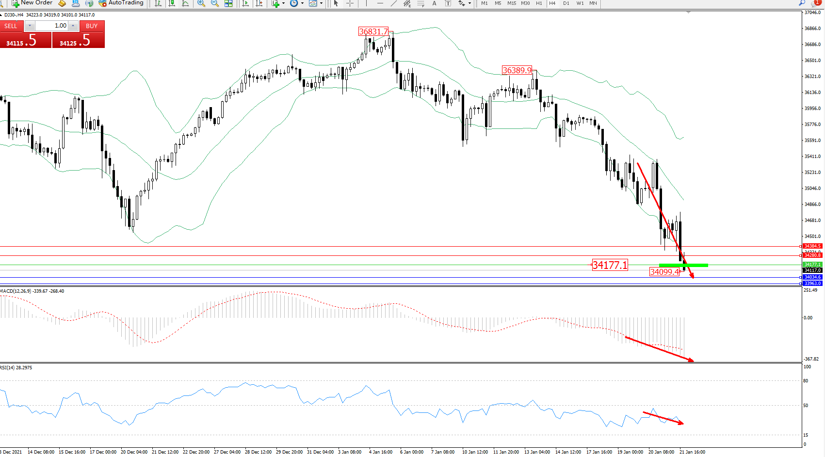 交易策略:34177下方看跌,目标34034、33963