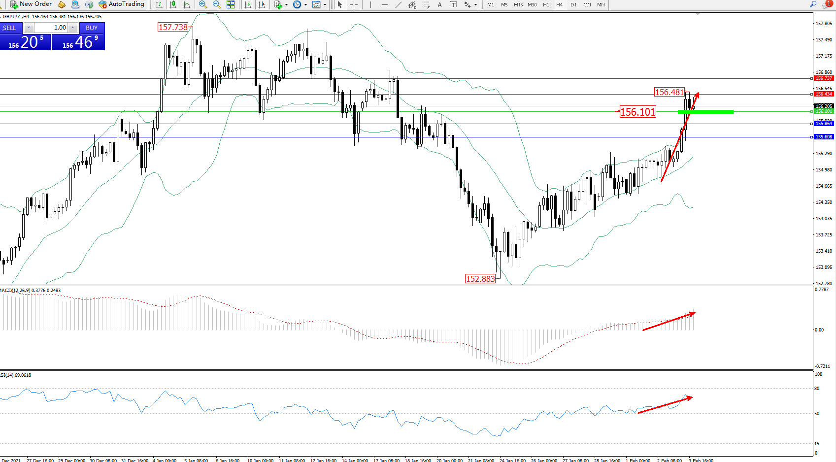 交易策略:156.101上方看涨,目标156.434、156.737