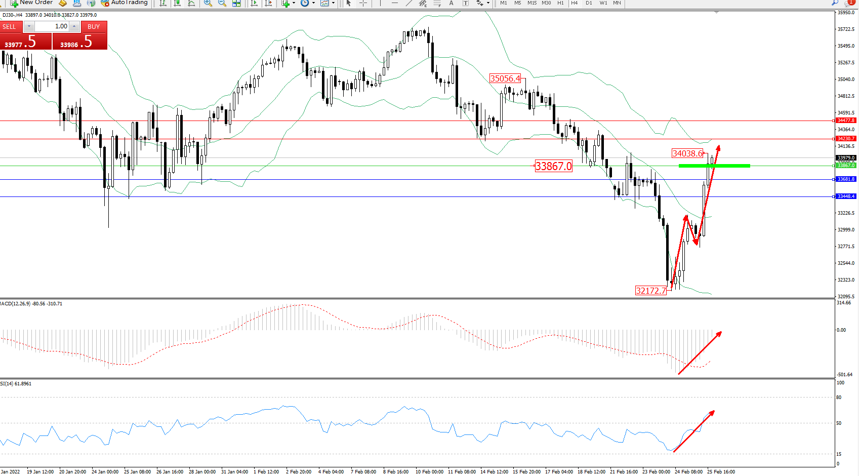 道琼斯指数DJ30——4小时K线图显示: