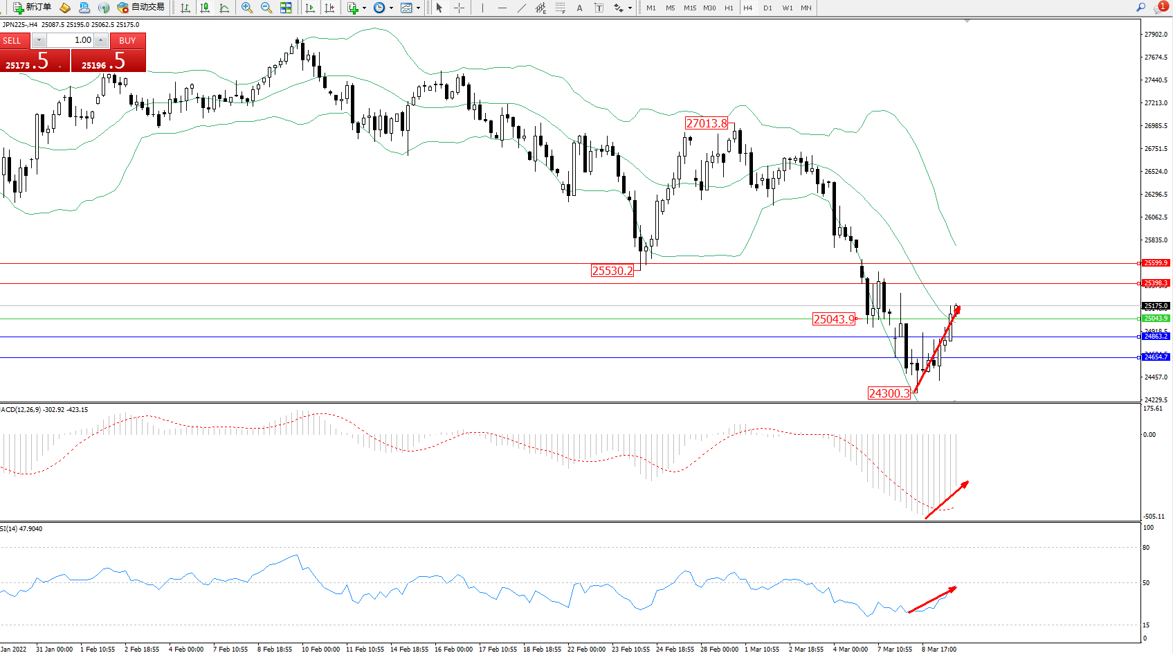 日经指数JPN225——4小时K线图显示: