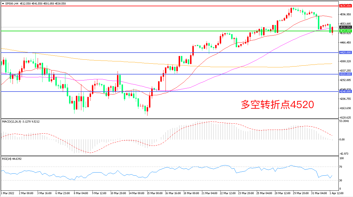 上周五(4月1日),经济数据和地缘局势的复杂影响继续引发市场动荡,美债收益率曲线再度传递衰退警报,标普500在风险情绪的退潮下震荡下行,收报4538.55点。本周市场的重点是美联储3月FOMC会议纪要,市场关心5月份加息50个基点的可能性有多大,紧缩的货币政策会对美股产生直接巨大的影响。