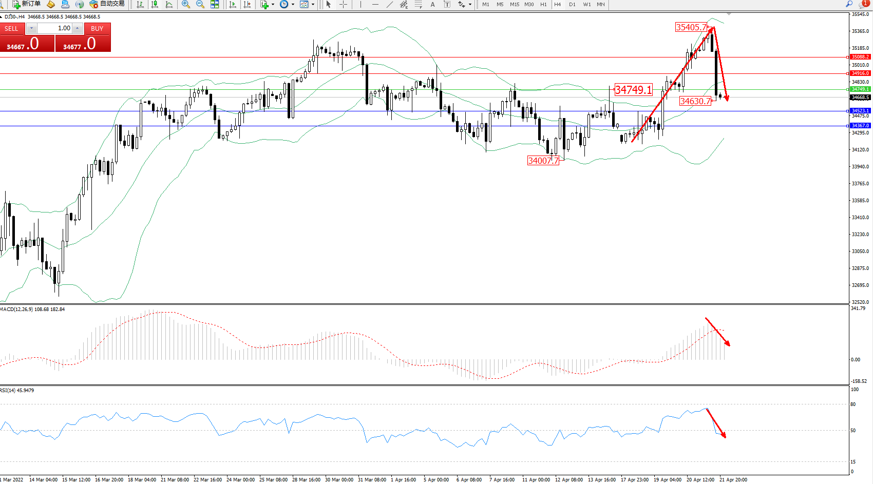 道琼斯指数4月21日(周四)收盘下跌368.49点,跌幅1.05%,报34792.30点;美联储主席鲍威尔在IMF的小组讨论会上称,“5月份会议上将对加息50基点进行讨论,我们致力于利用工具来将通胀率拉回到2%的目标水平”。鲍威尔称,如果时机合适,加息前置策略有一定益处,加息50基点一事是个讨论的方向。他拒绝对市场定价发表评论,但指出美联储3月会议纪要显示,许多官员支持进行至少一次规模50基点的加息以给通胀降温。利率期货市场预计5月3-4日会议上美联储加息50基点的概率为100%,6月份加息50基点也已经板上钉钉。投资者预计7月份将进行第三次50基点的升息。