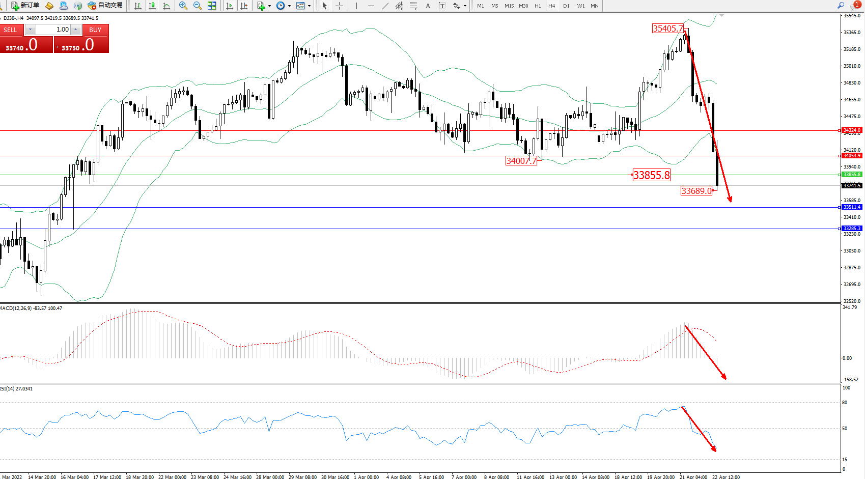 道琼斯指数DJ30——4小时K线图显示: