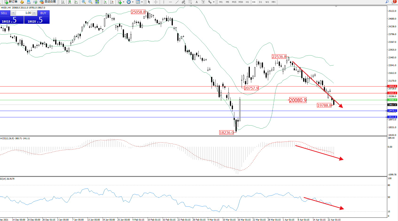 恒指HK50 ——4小时K线图显示: