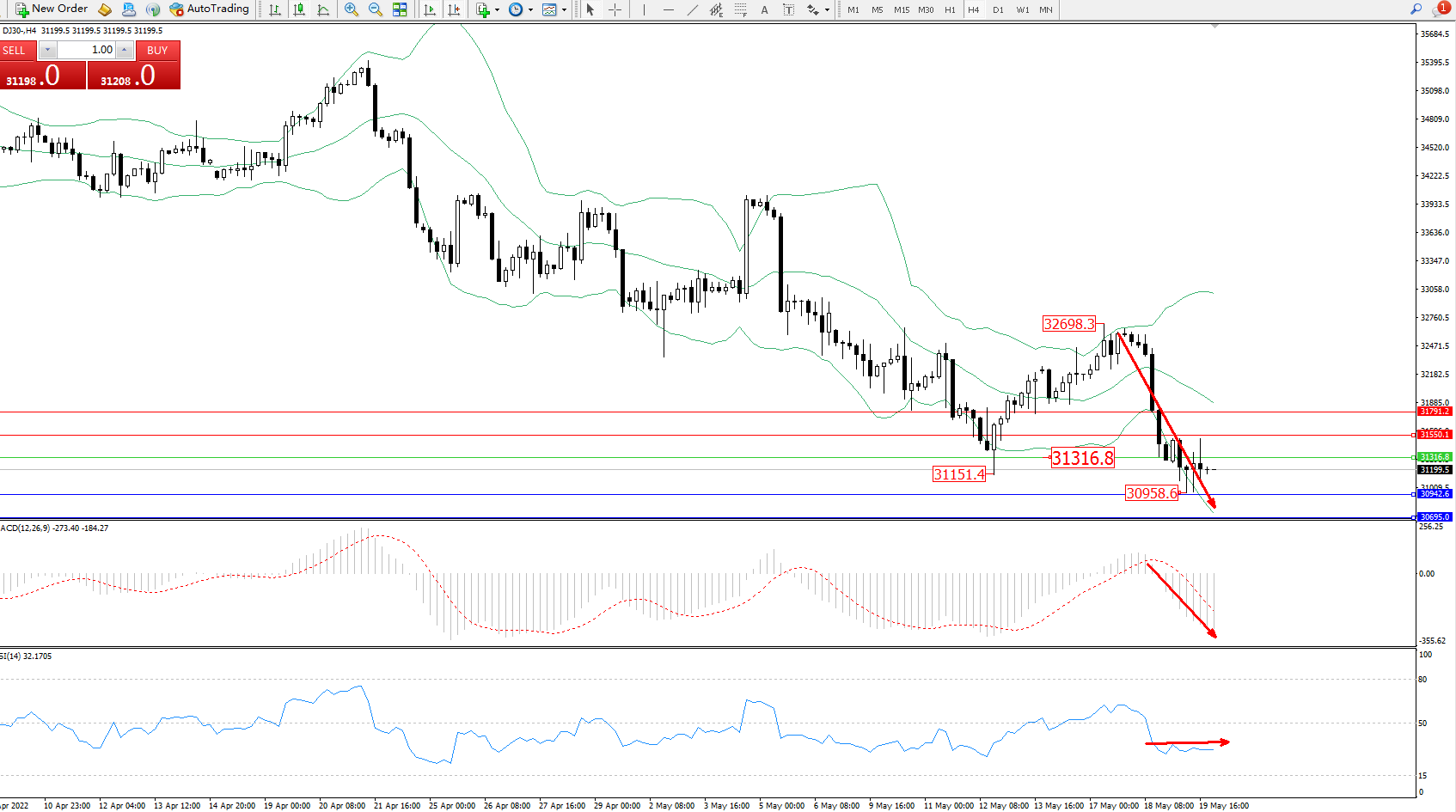 道琼斯指数DJ30——4小时K线图显示: