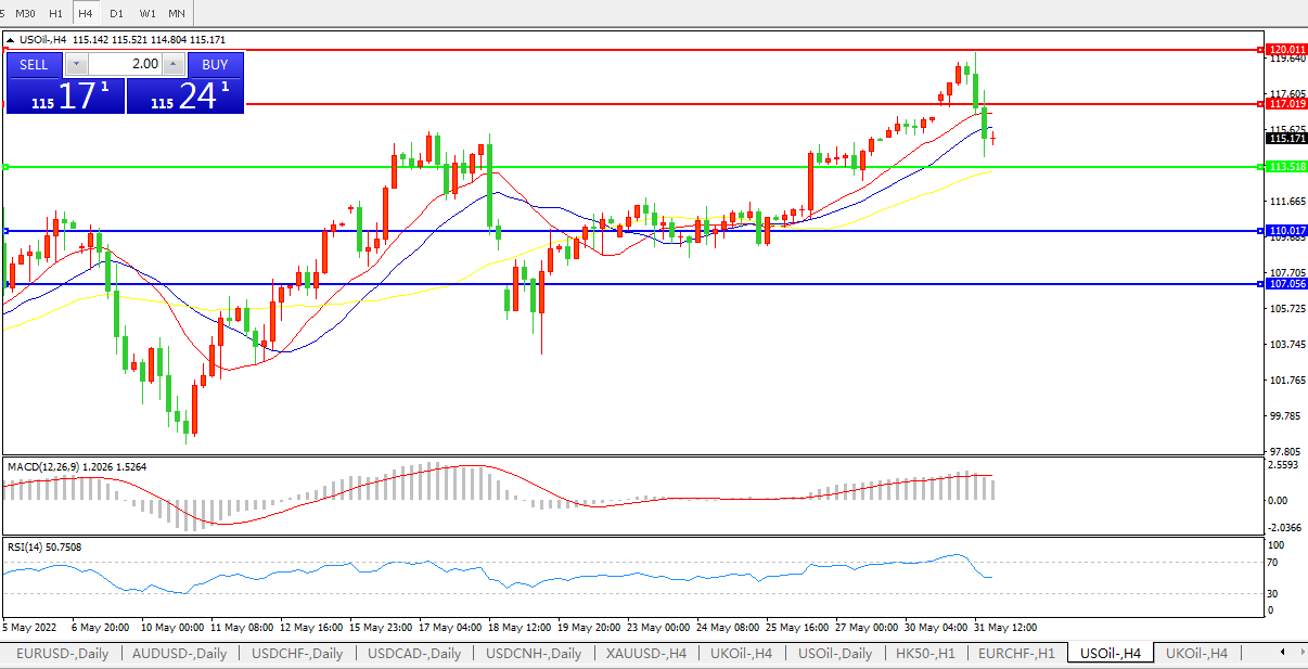 4小时图看,油价跌破均线下行,短线走势偏 MACD动能柱缩短RSI指标走,日内延续弱势概率较大。