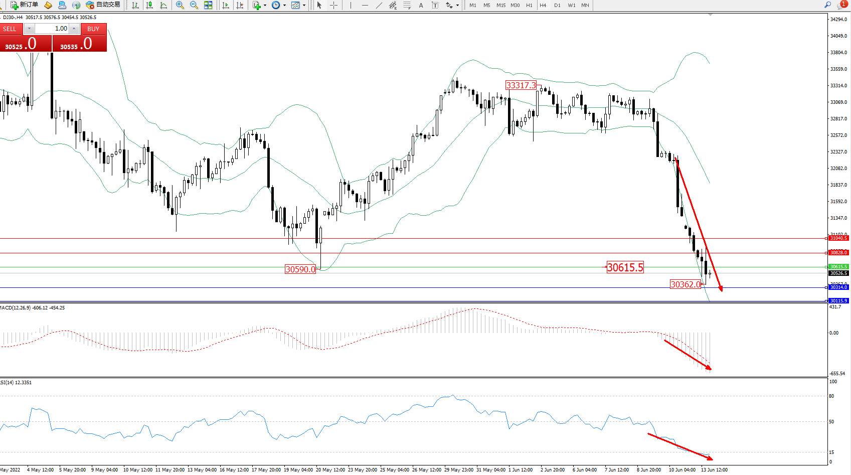 道琼斯指数DJ30——4小时K线图显示: