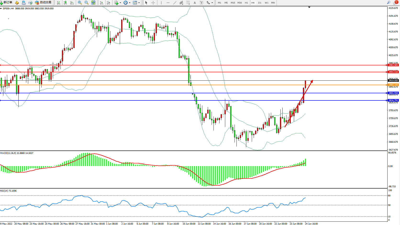 标普500指数6月24日(周五)收盘上涨116.42点,涨幅3.07%,报3912.15点;预计美国政策制定者将保持非常谨慎的态度,因为飙升的通胀迄今尚未出现见顶的迹象,这将促使美联储在不久的将来采取更激进的措施,尽管鲍威尔主席的语气略显平静,未来几个月的通胀报告将是美联储行动的主要驱动力。