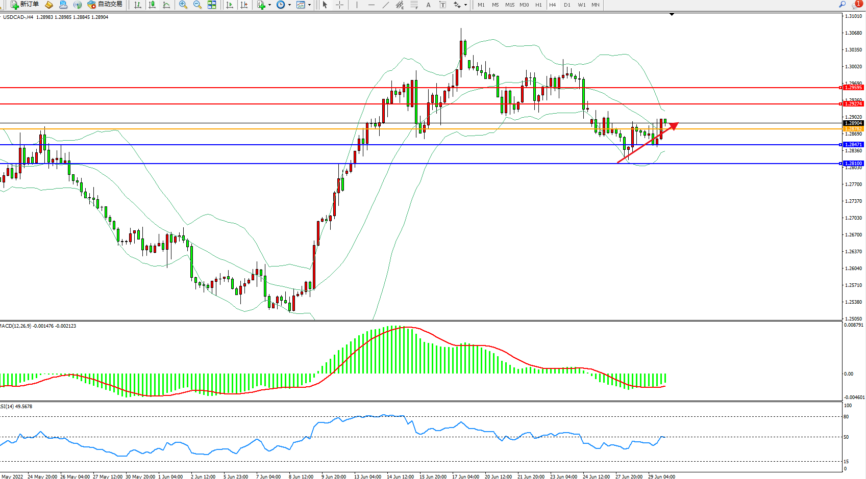 美元加元USDCAD——4小时K线图显示