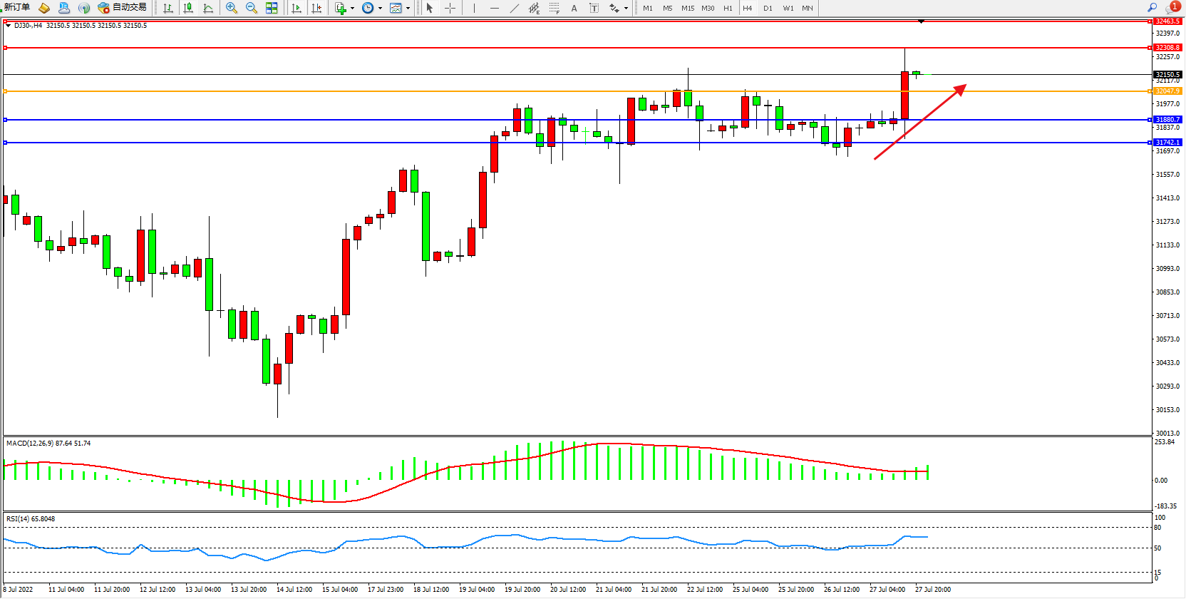 道琼斯指数DJ30——4小时K线图显示: