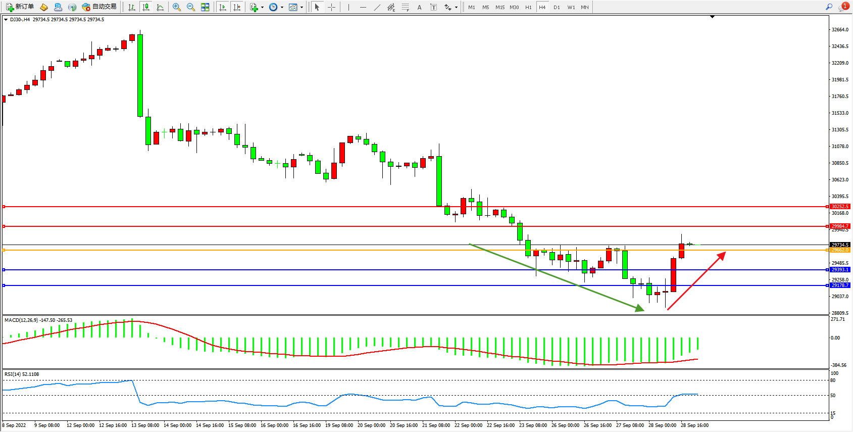 道琼斯指数DJ30——4小时K线图显示: