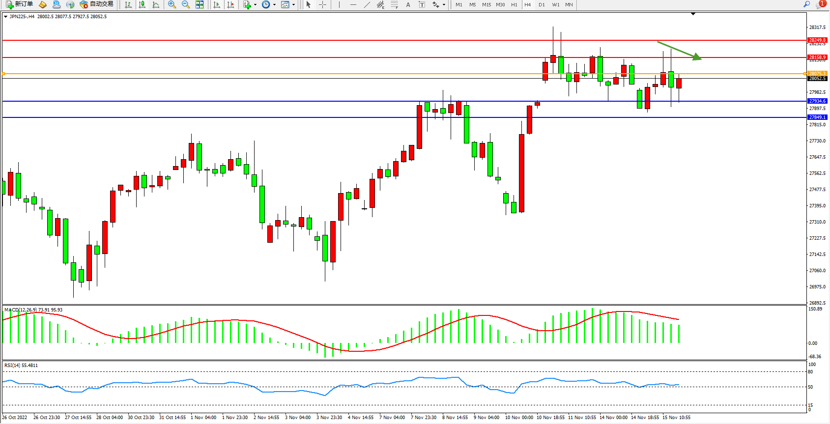 日经指数JPN225——4小时K线图显示: