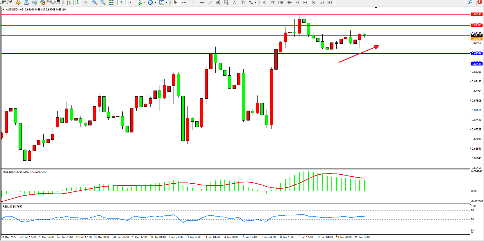 交易策略:0.69035上方看涨,目标0.69309、0.69530