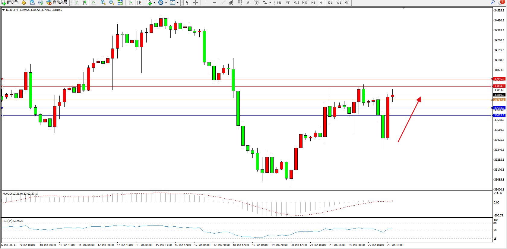 道琼斯指数DJ30——4小时K线图显示: