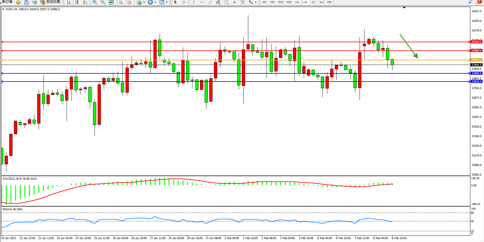 道琼斯指数DJ30——4小时K线图显示: