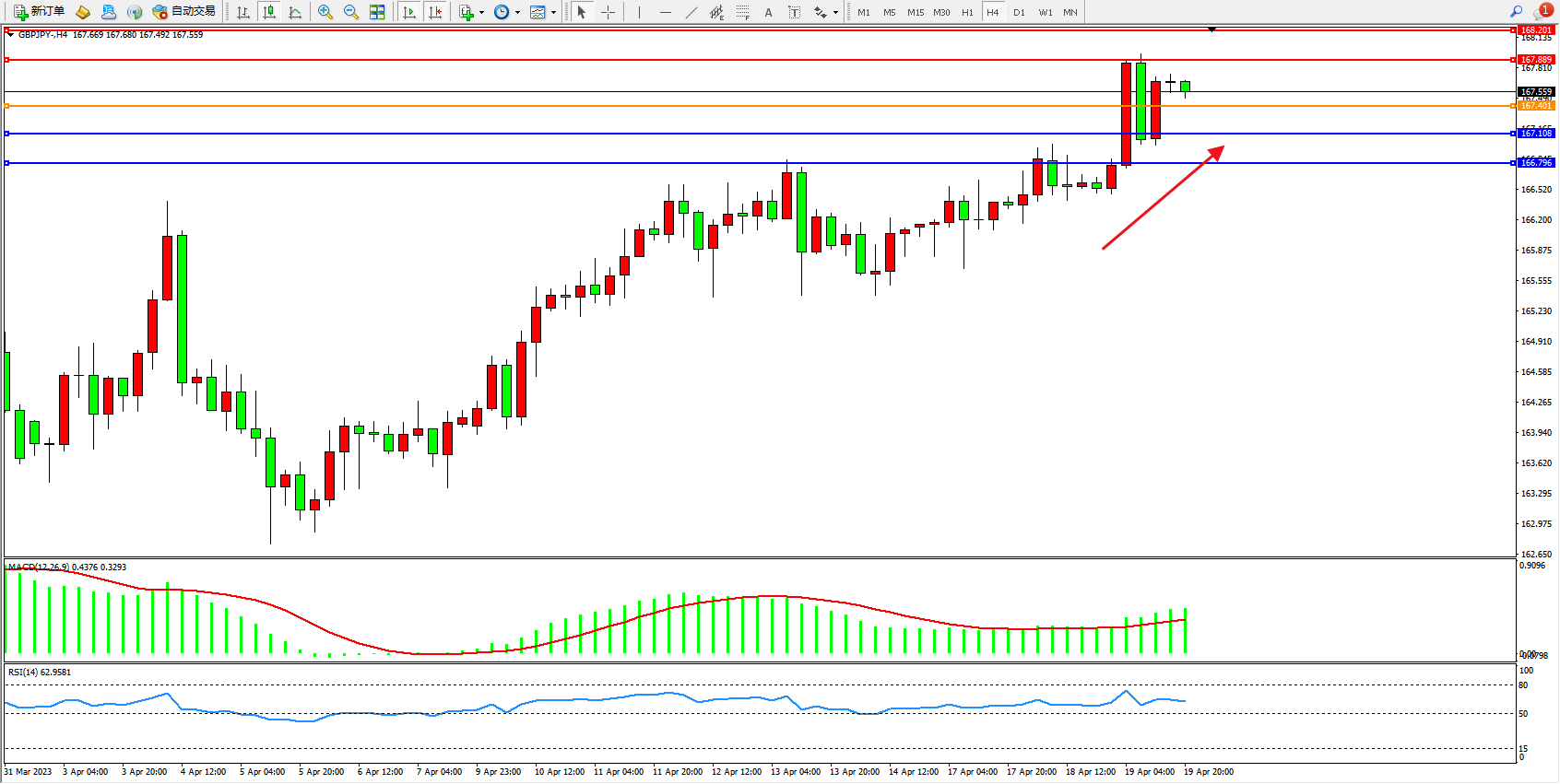 交易策略:167.401上方看涨,目标167.889 168.201