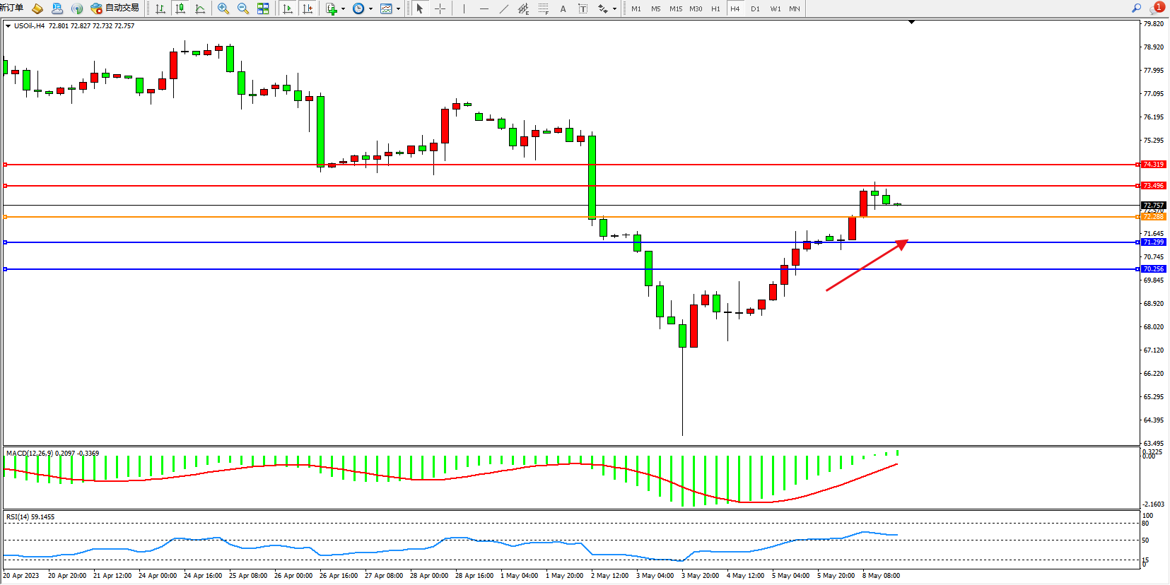 交易策略:72.288上方看涨,目标73.496  74.319
