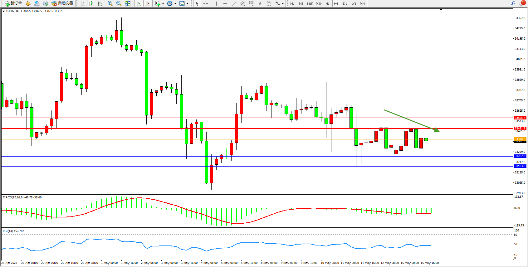 交易策略:33398下方看跌,目标33262 33183